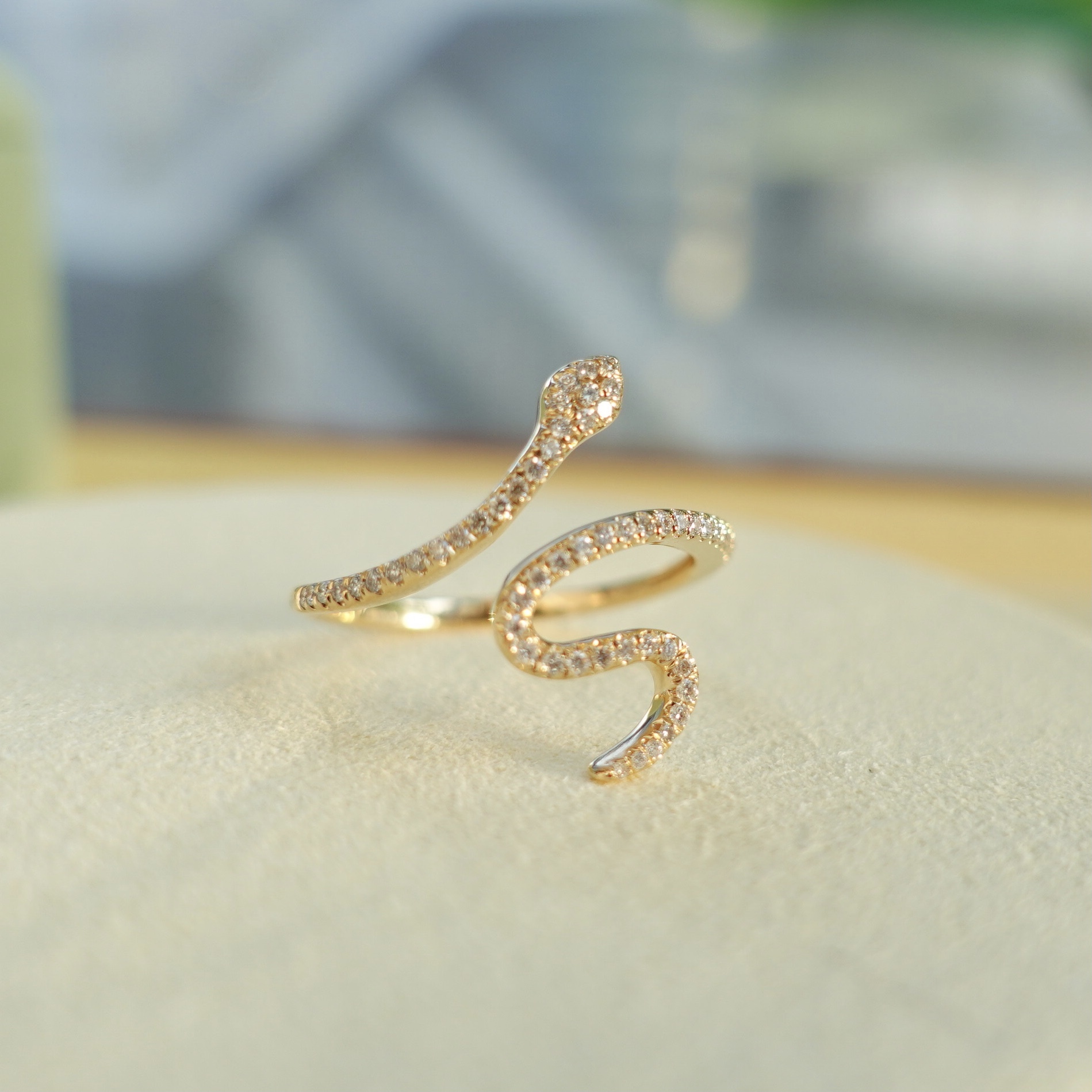 專注於線條的刻劃,戒指的蛇形態取決於線條的粗細和厚度,並用鑽石鑲口代替蛇身的質感,讓靈蛇戒指栩栩如生,彷彿隨時可以脫離戒指跳動