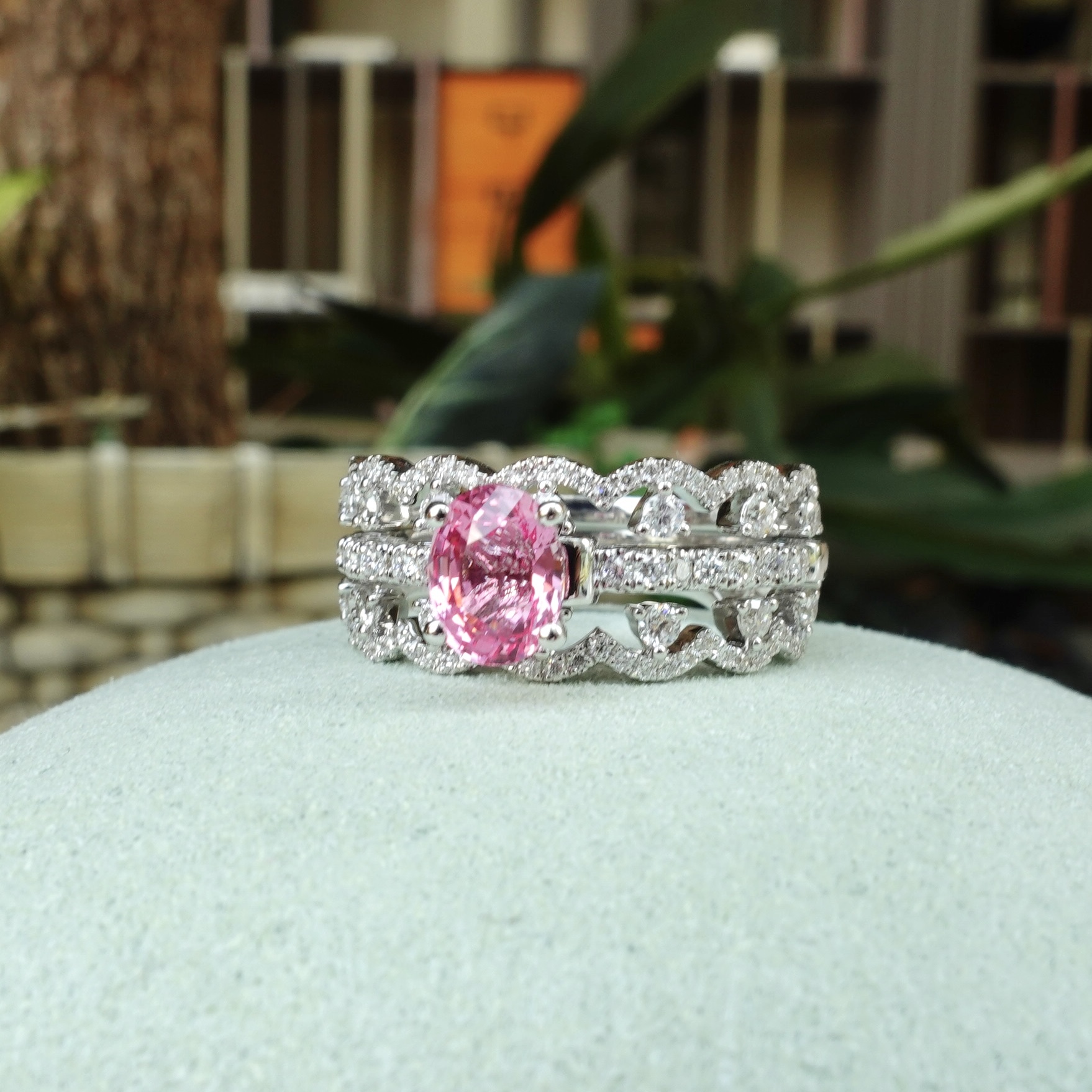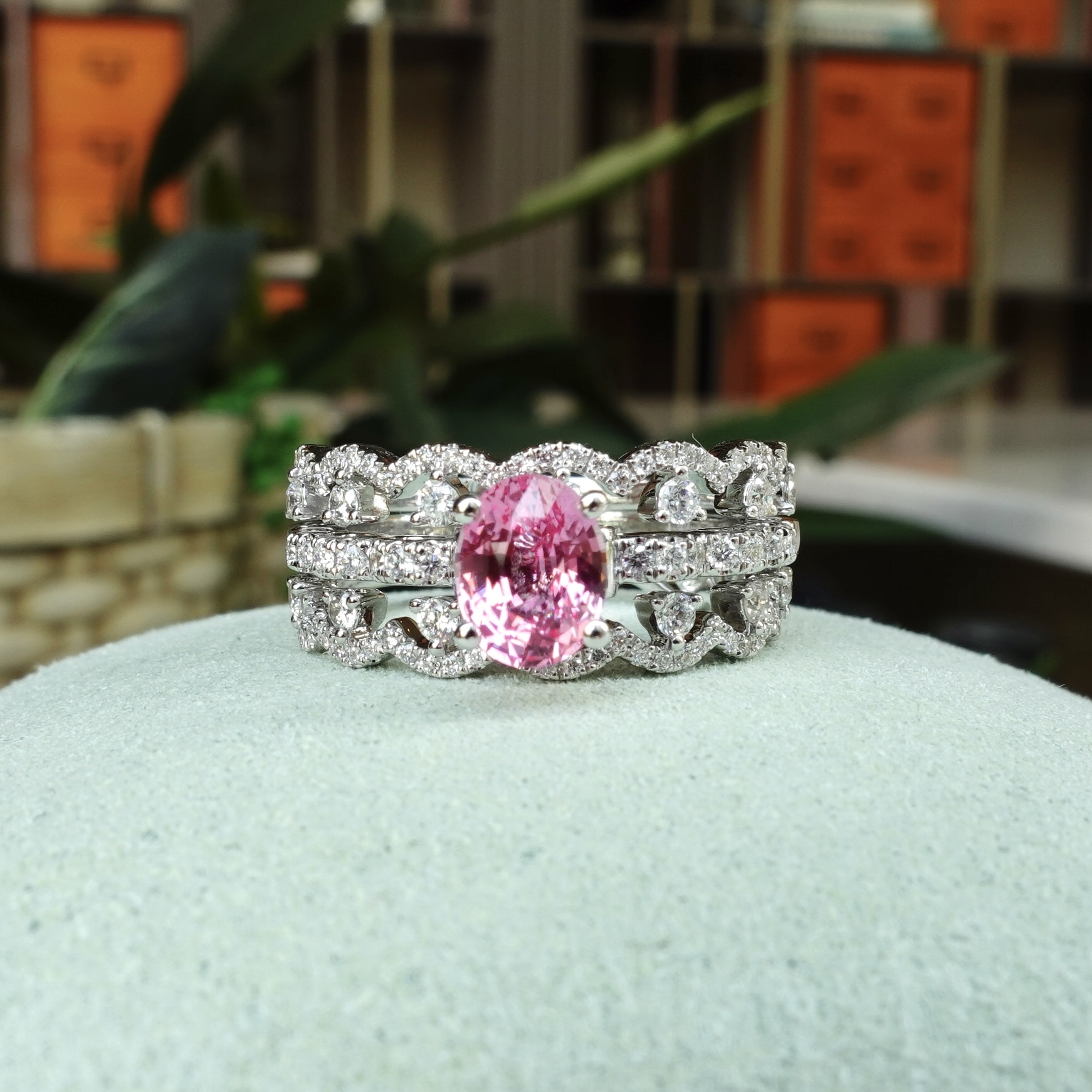 日出色Padparadscha滿溢甜美光暈,橢圓切割迸發極致火彩✨一套三戒,獨家設計「收腰底托」,讓主石戒與蕾絲鑽石排戒完美嵌合。單戴時優雅自若,疊戴則璀璨奪目——隨手搭配,日常佩戴即刻升級為設計師收藏!