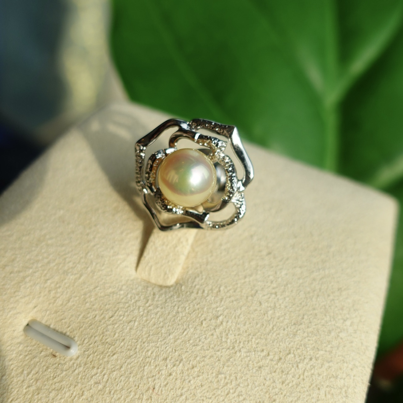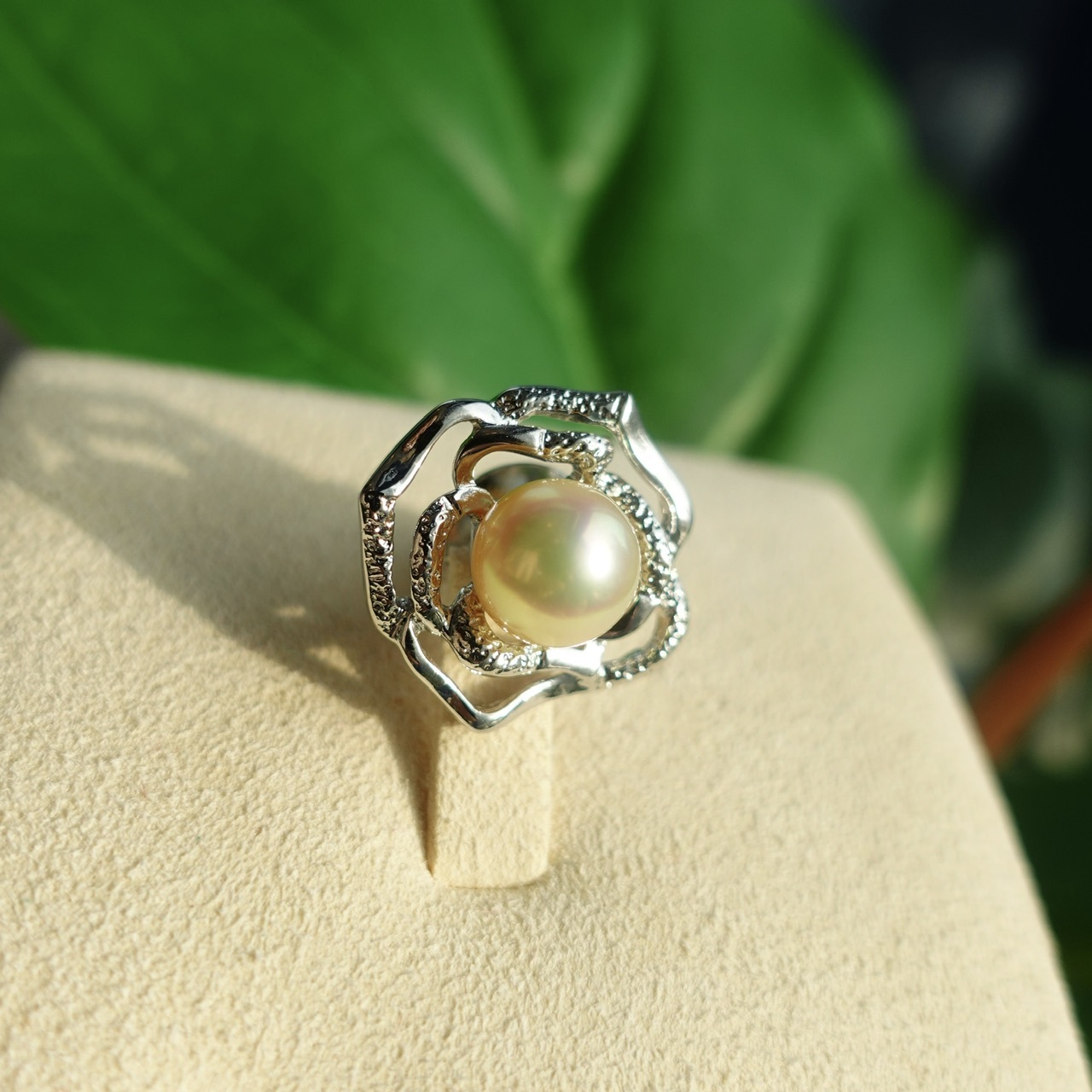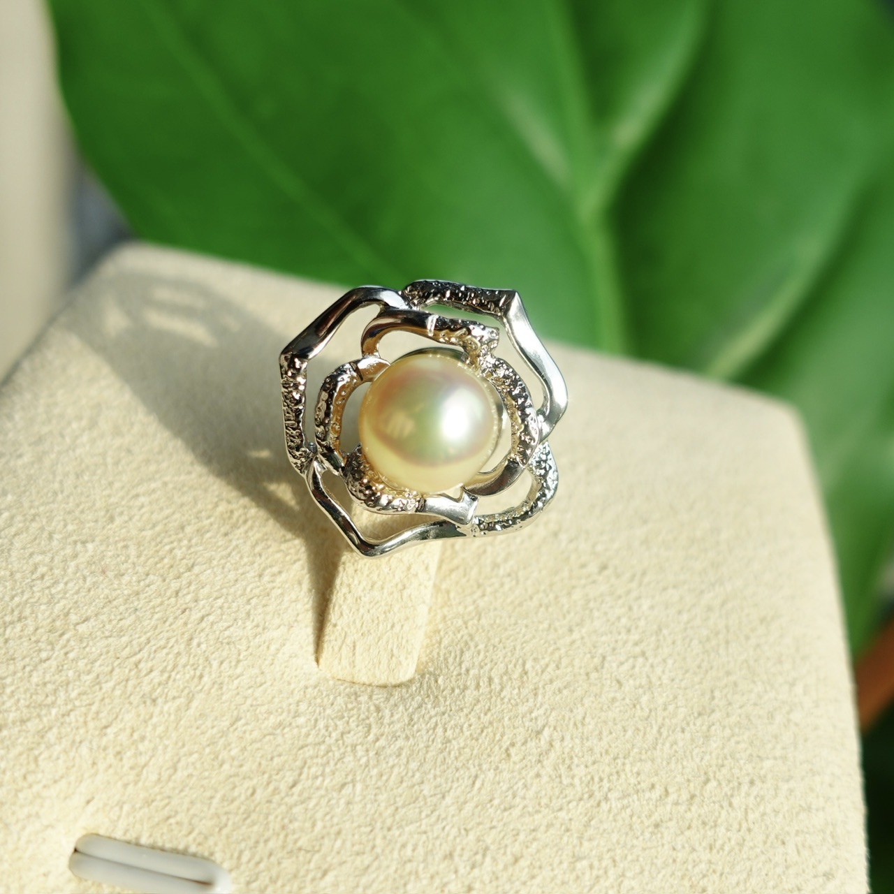鏤刻成玫瑰凋的姿態。鏤空處,光可以穿過,像記憶穿過歲月,只留下最溫柔的輪廓。花心鑲一顆天然香檳金Akoya,不是初綻時的嫩粉,不是盛放時的豔紅—是玫瑰對自己說的晚安,是花瓣落盡後,夕陽最後一抹吻痕。